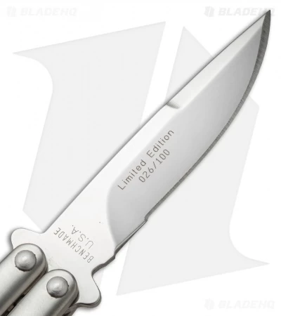 The Benchmade model 35 offers a rare chance to own a piece of Benchmade history. It features skeletonized stainless steel handles and a bayonet style blade with a polished finish. A sturdy latch secures the blade in the open or locked position. Includes a nylon belt sheath.